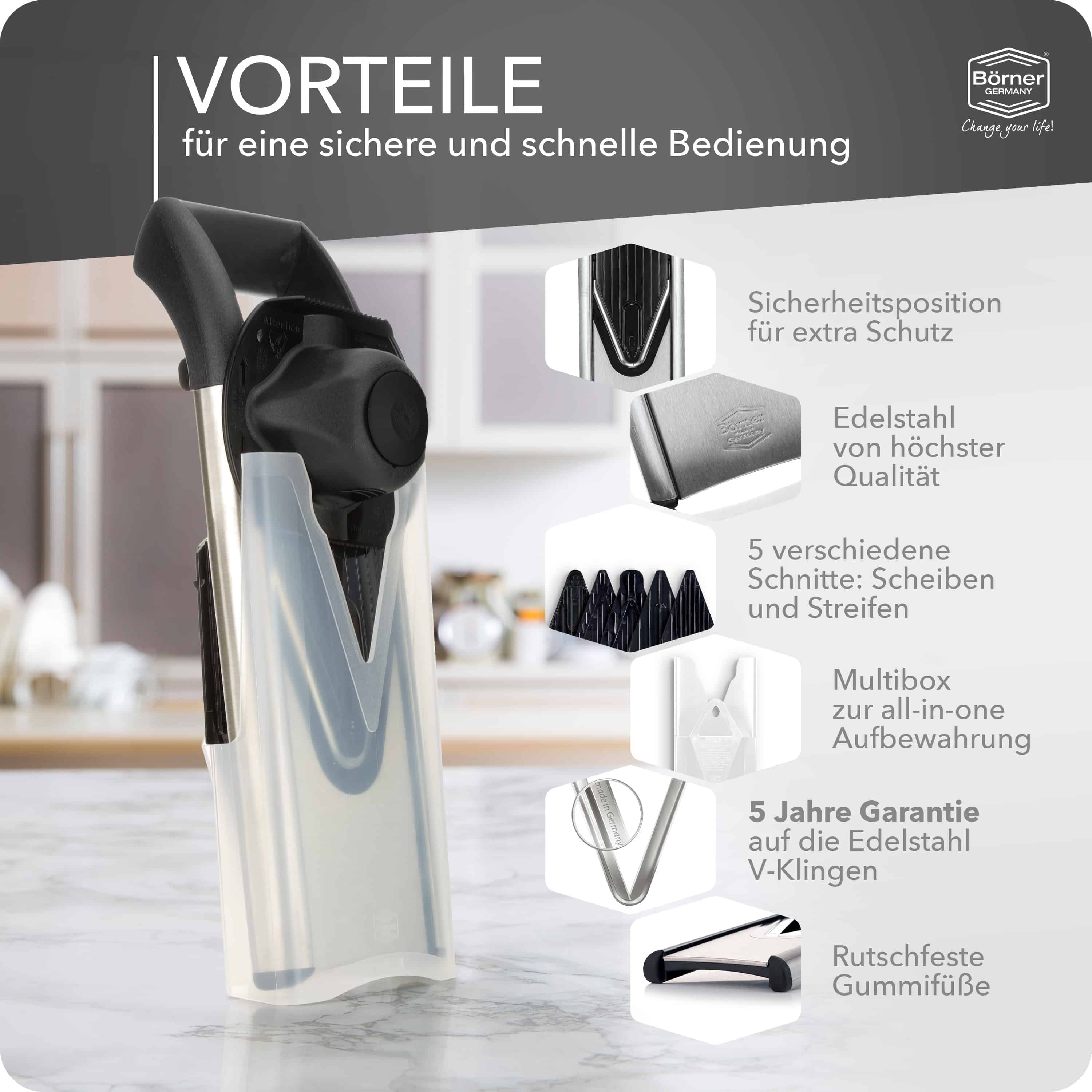 Der original Börner V6 ExclusiveLine ist die Edelstahl-Version unseres beliebten Börner V3. Besonders durch seine extreme Langlebigkeit, aufgrund des hochwertigen Materials aus gebürstetem Edelstahl, kann der V6 Gemüsehobel überzeugen!